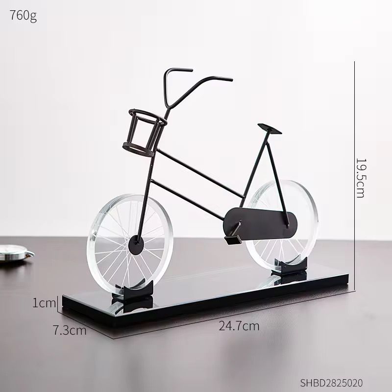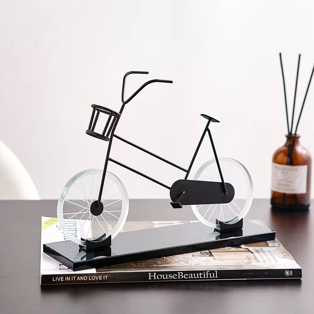 This artistic bicycle sculpture features a minimalist metal frame with transparent acrylic wheels, mounted on a sleek black base. Its clean lines and creative form make it a charming decorative accent for desks, bookshelves, or coffee tables, adding a touch of modern whimsy to any interior setting.