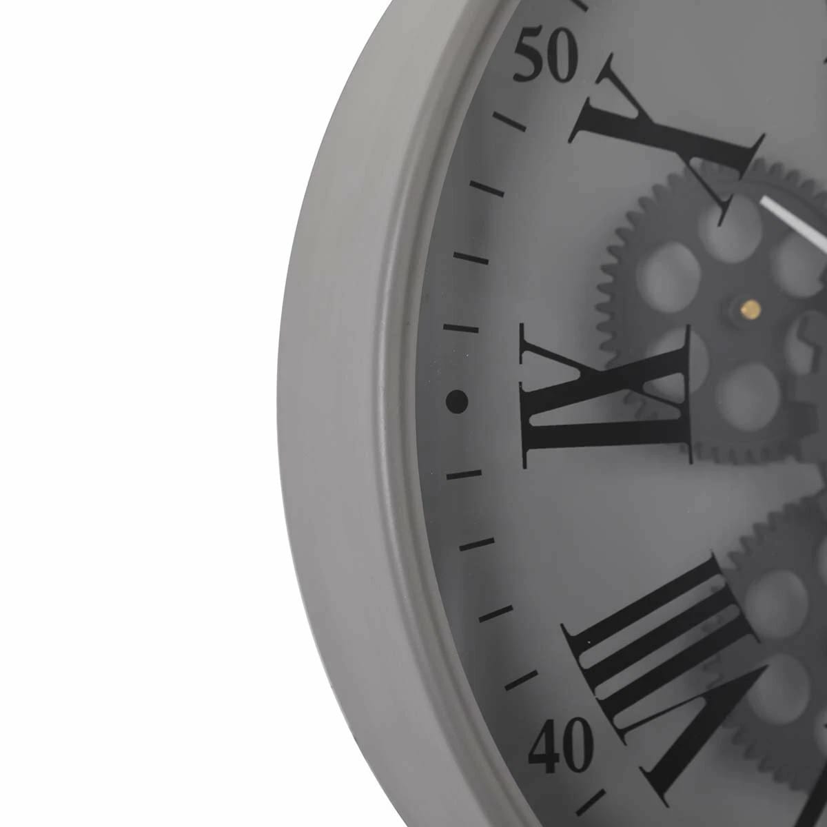 Details and Features: Materials: Distressed Metal, Plastic & Glass Glass Lens Step movement (ticking) Exposed 3D moving mechanism - engaging and unique Dark, neutral color combination makes it easy to match any space Gears and clock work on separate batteries so you can work one without the other Perfect for small walls and spaces Roman Numerals Dimensions: 36cm Wide x 36cm High x 6.5cm Deep Weight: 2kg Batteries required: 1 x AA for the clock, 2 x AA for the rotating cogs